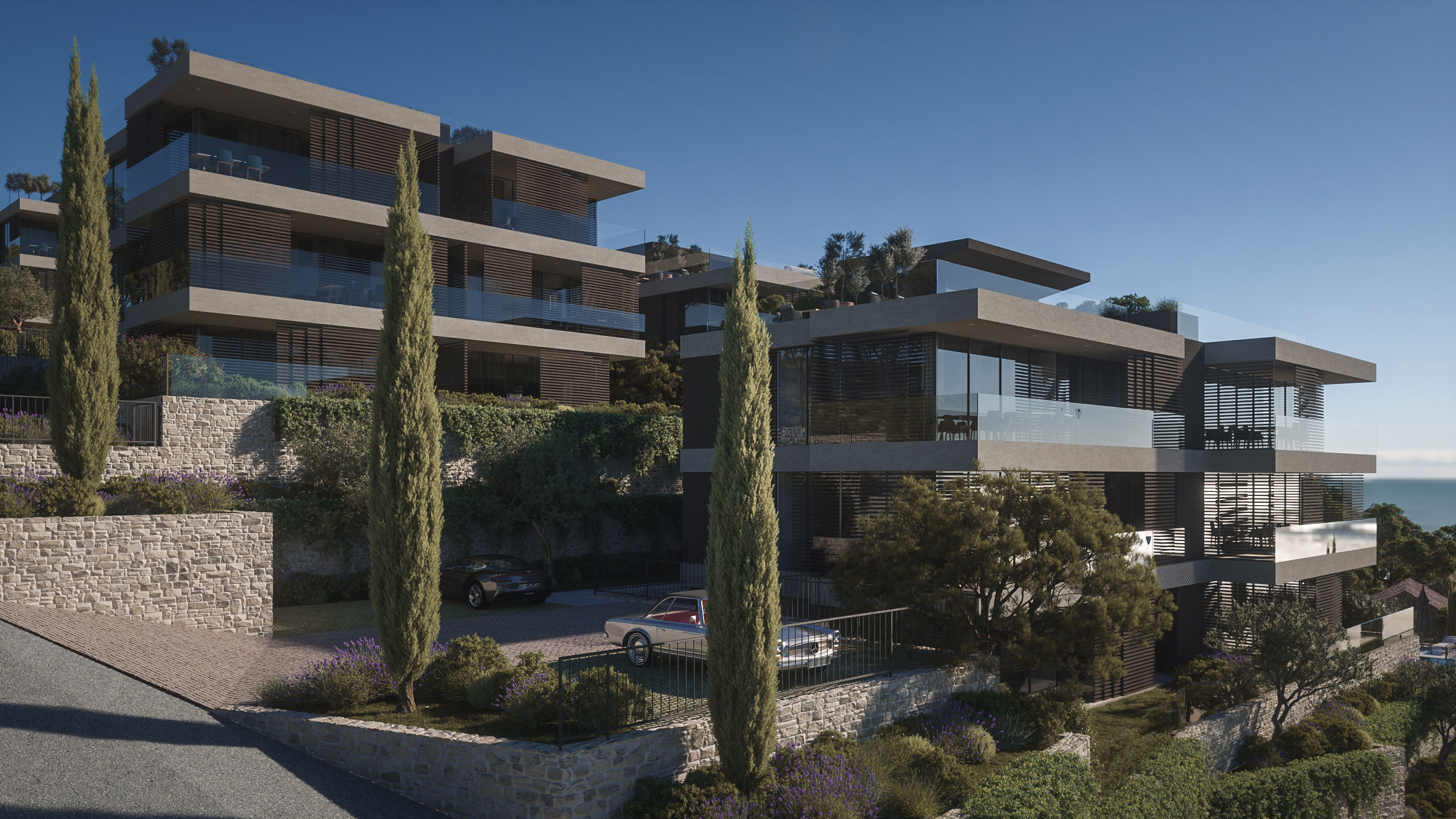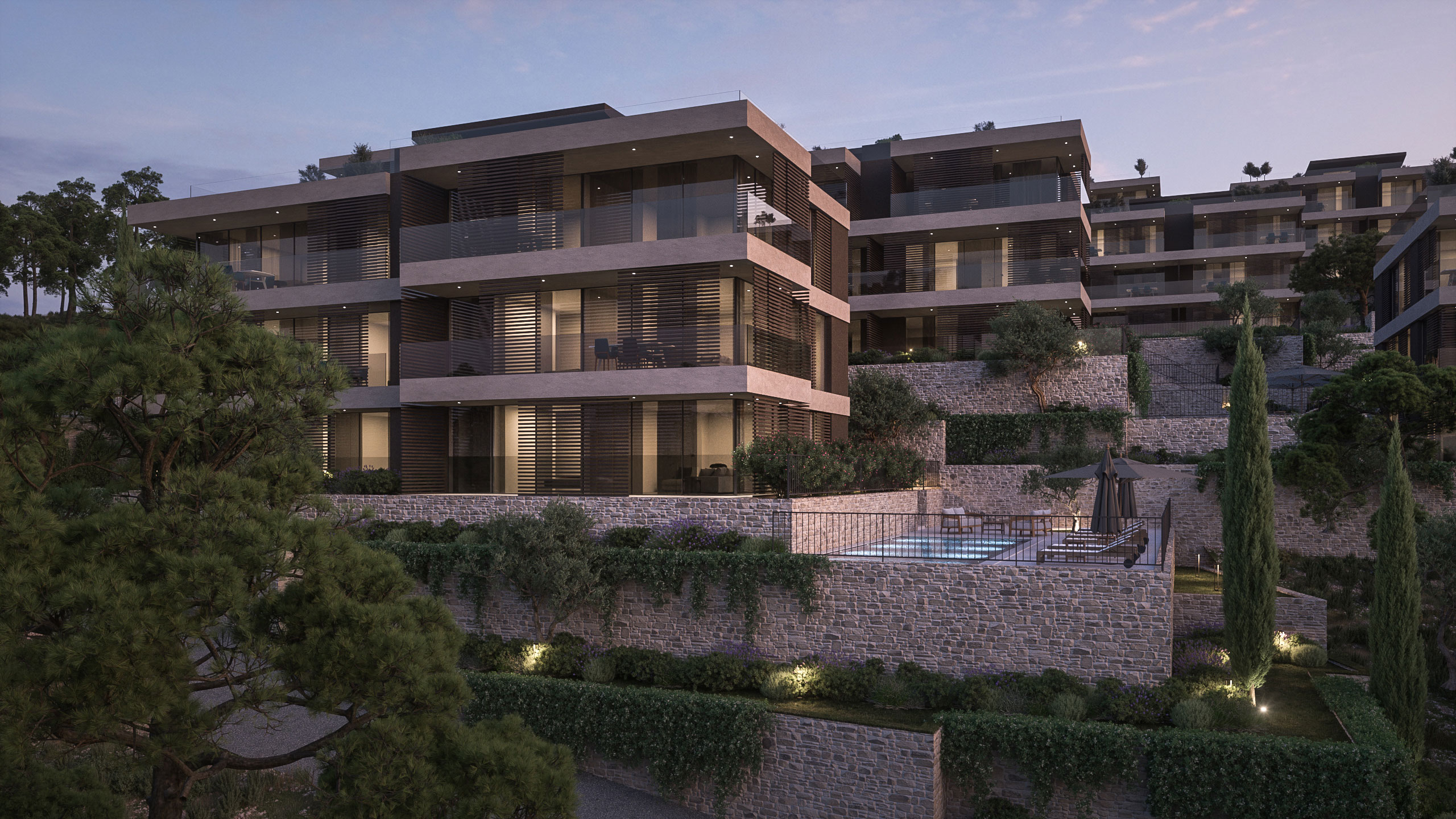 The emphasis was on integrating the volumes into the existing landscape and greenery as much as possible. Also, the emphasis was on landscape design through the use of autochthonous mediterranean plant species.